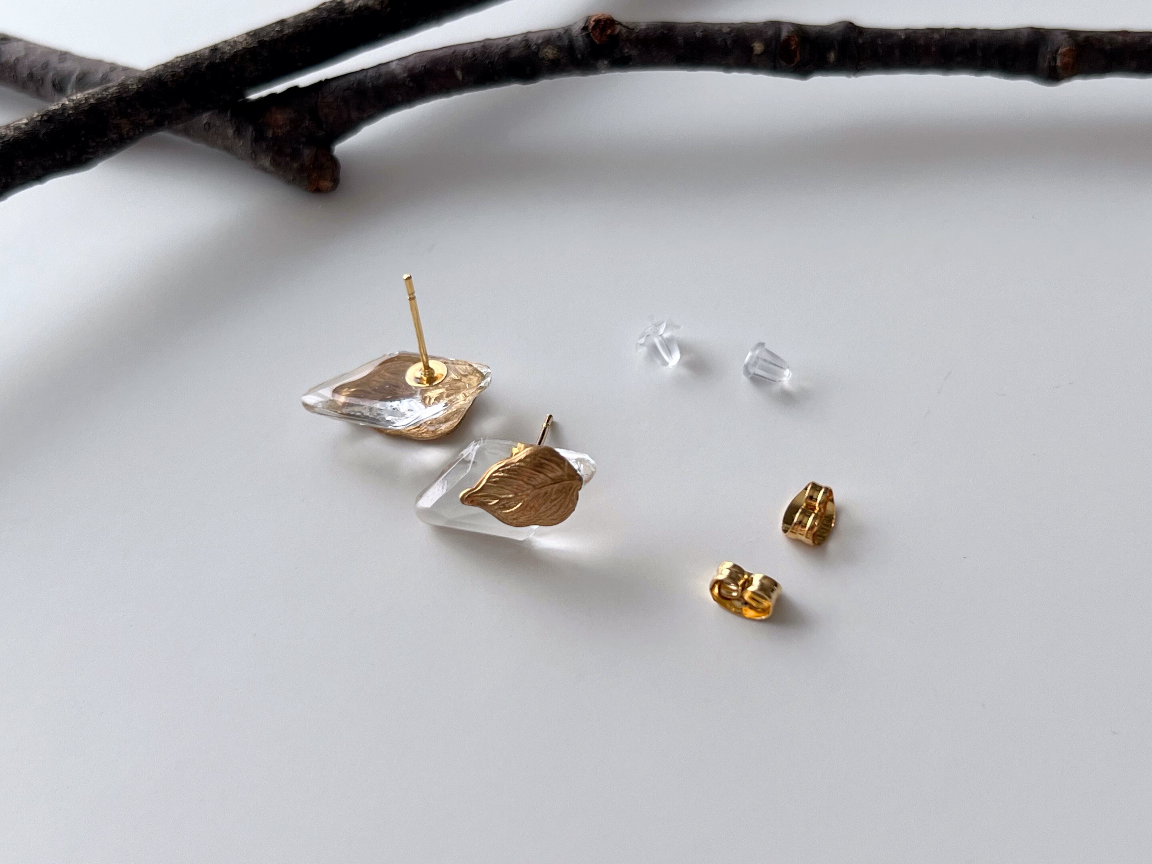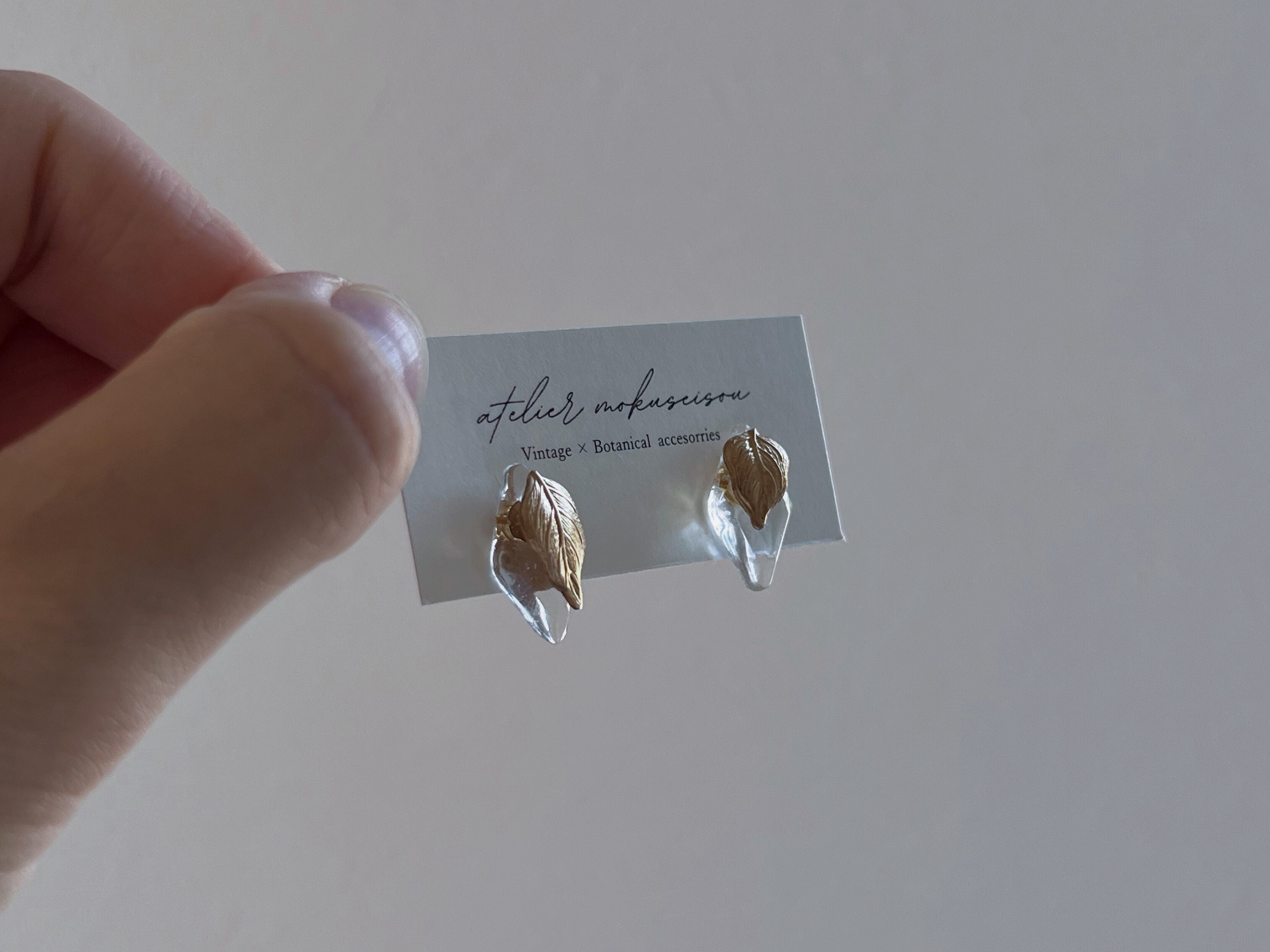 【 calme 】ヴィンテージガラスと真鍮リーフの耳飾り/ピアス/イヤリング/ボタニカル/クリア/シンプル