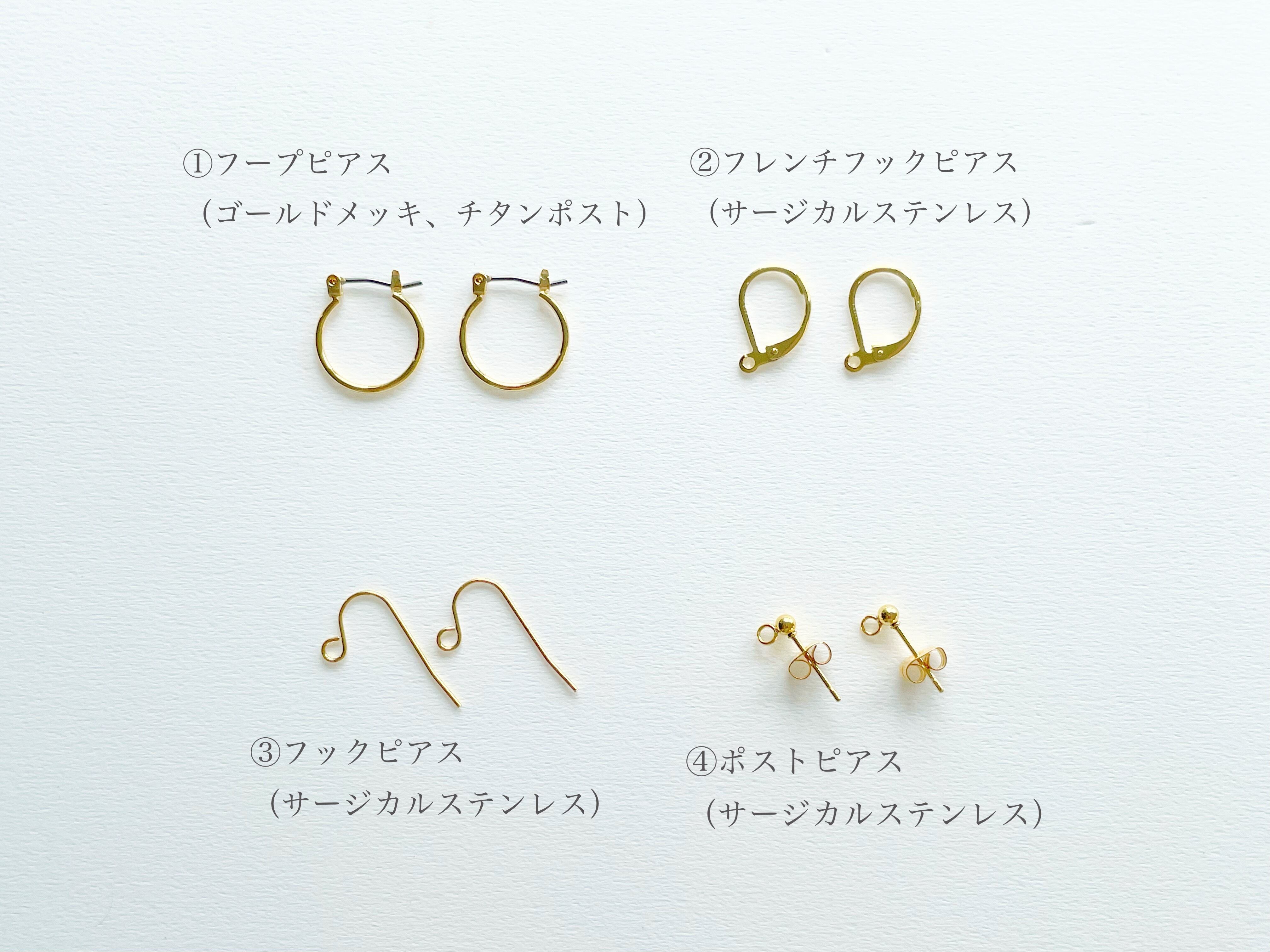 ピアスやイヤリングの金具は数種ご用意しておりますので、
