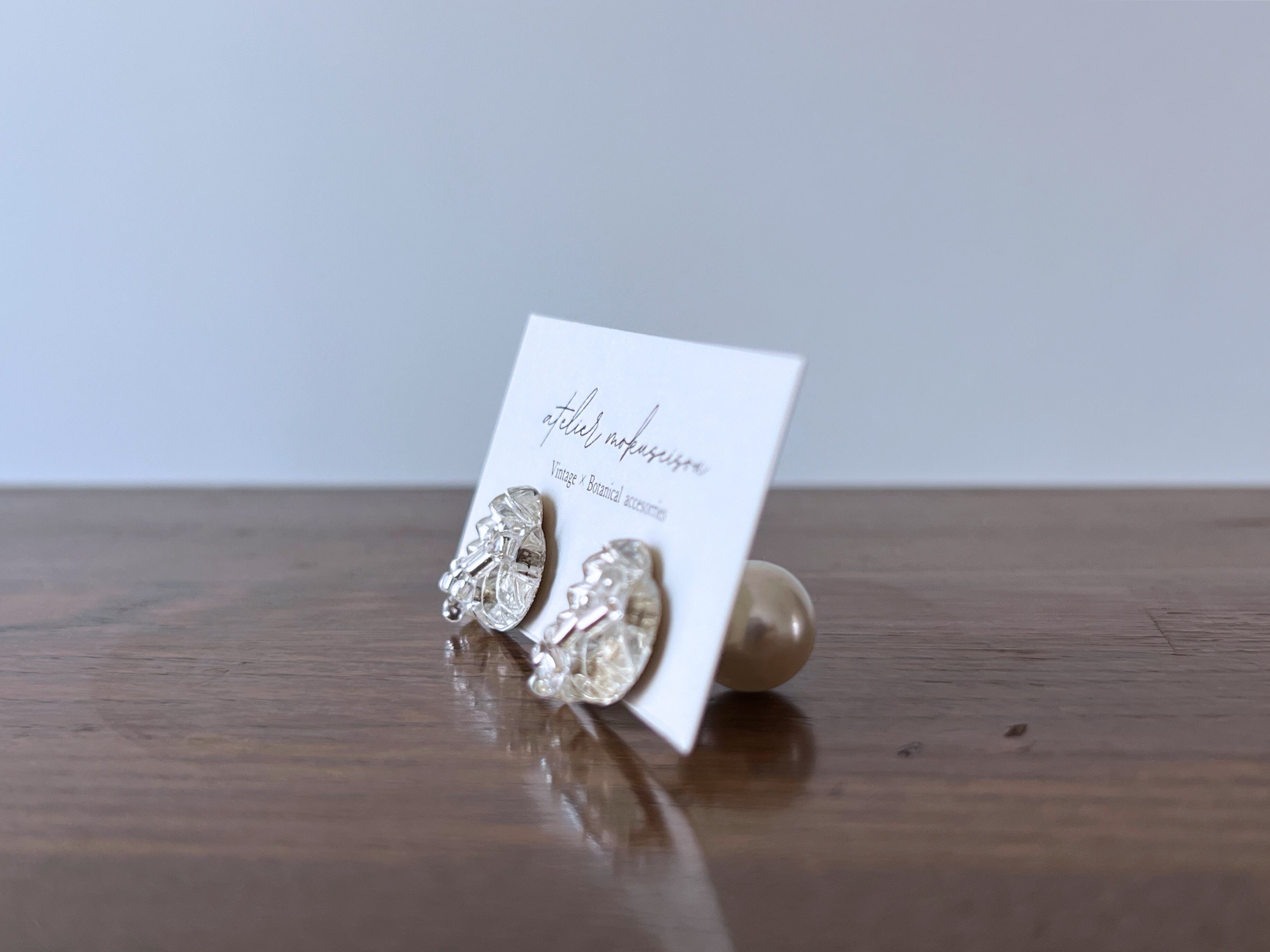 【 pure 】ヴィンテージガラス製リーフの耳飾り/ピアス/イヤリング/真鍮/ボタニカル/クリア