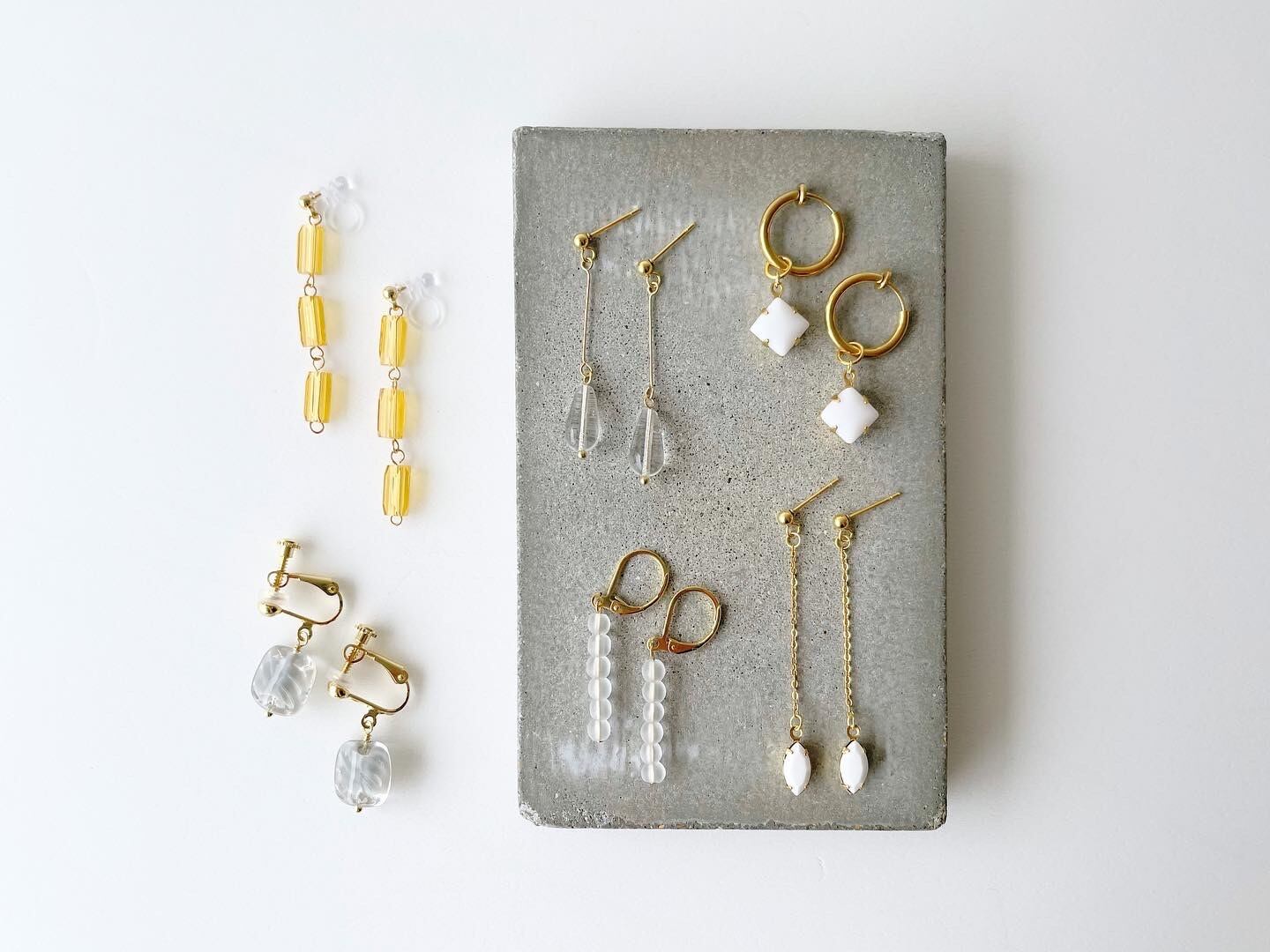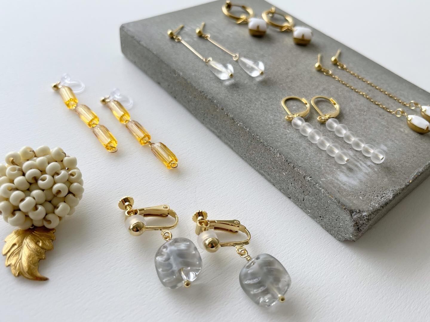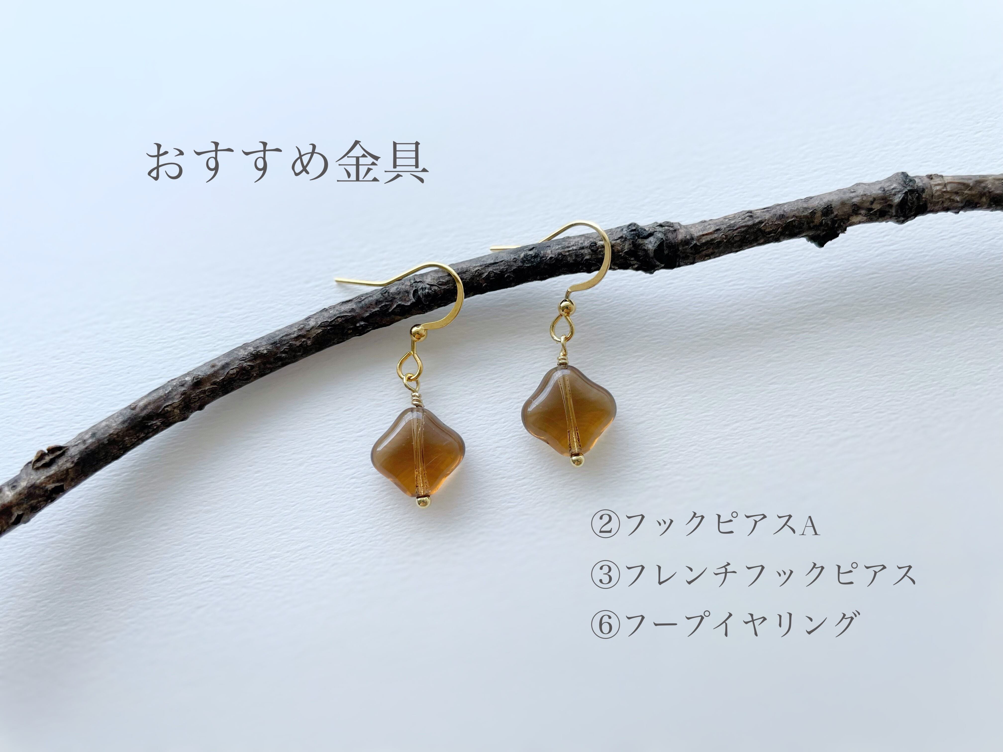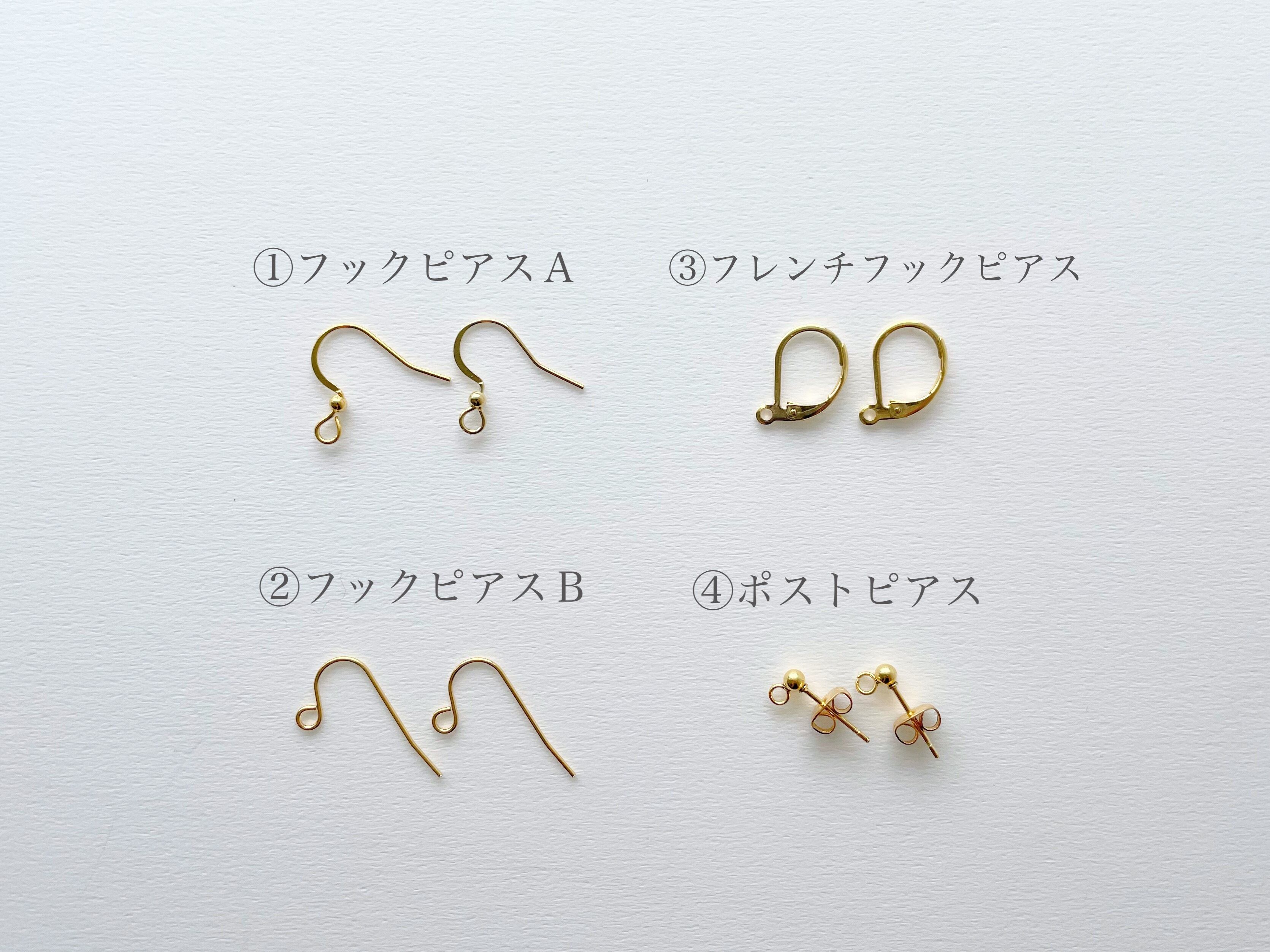 ピアスやイヤリングの金具は数種ご用意しておりますので、
