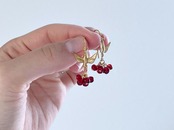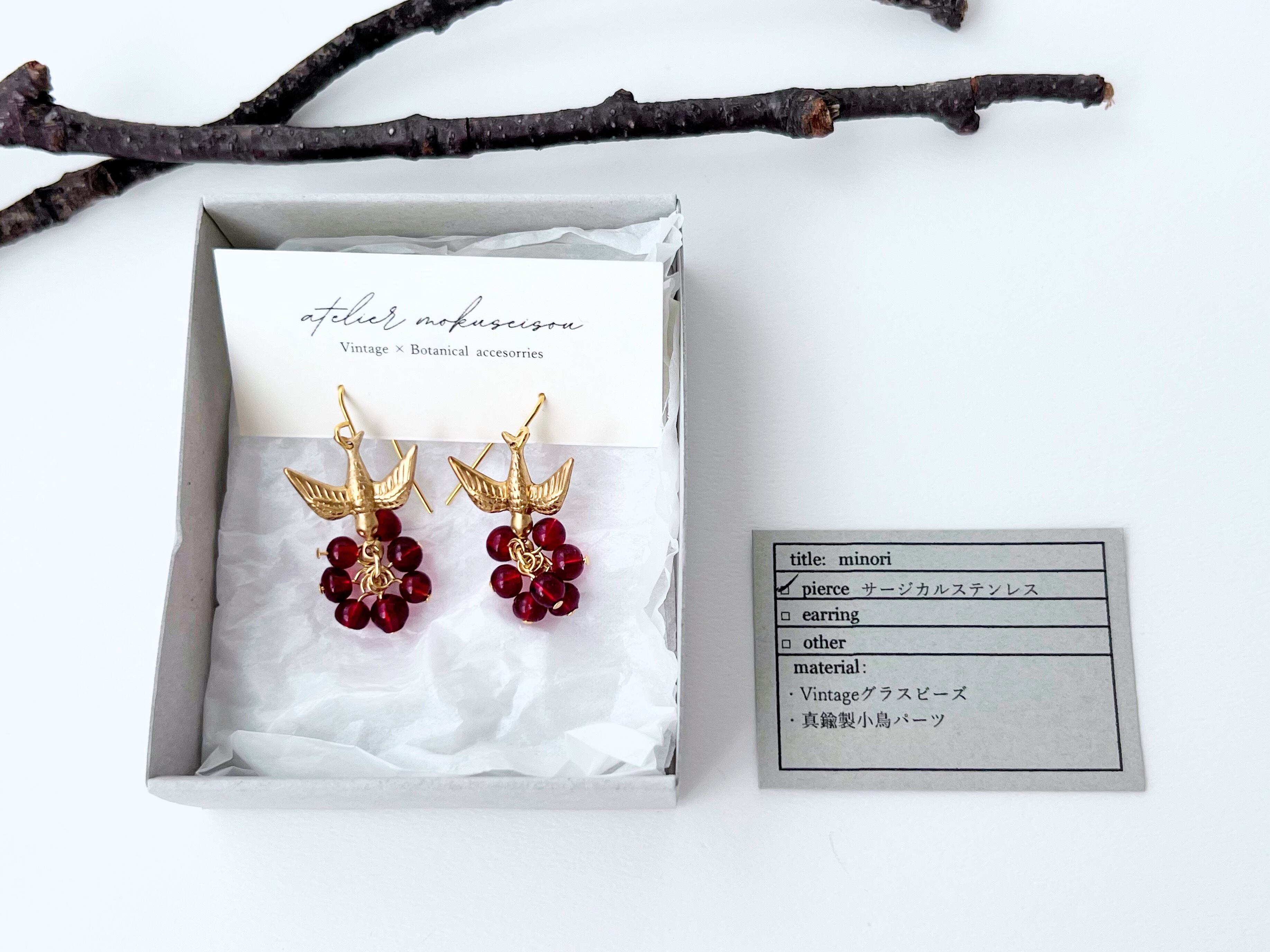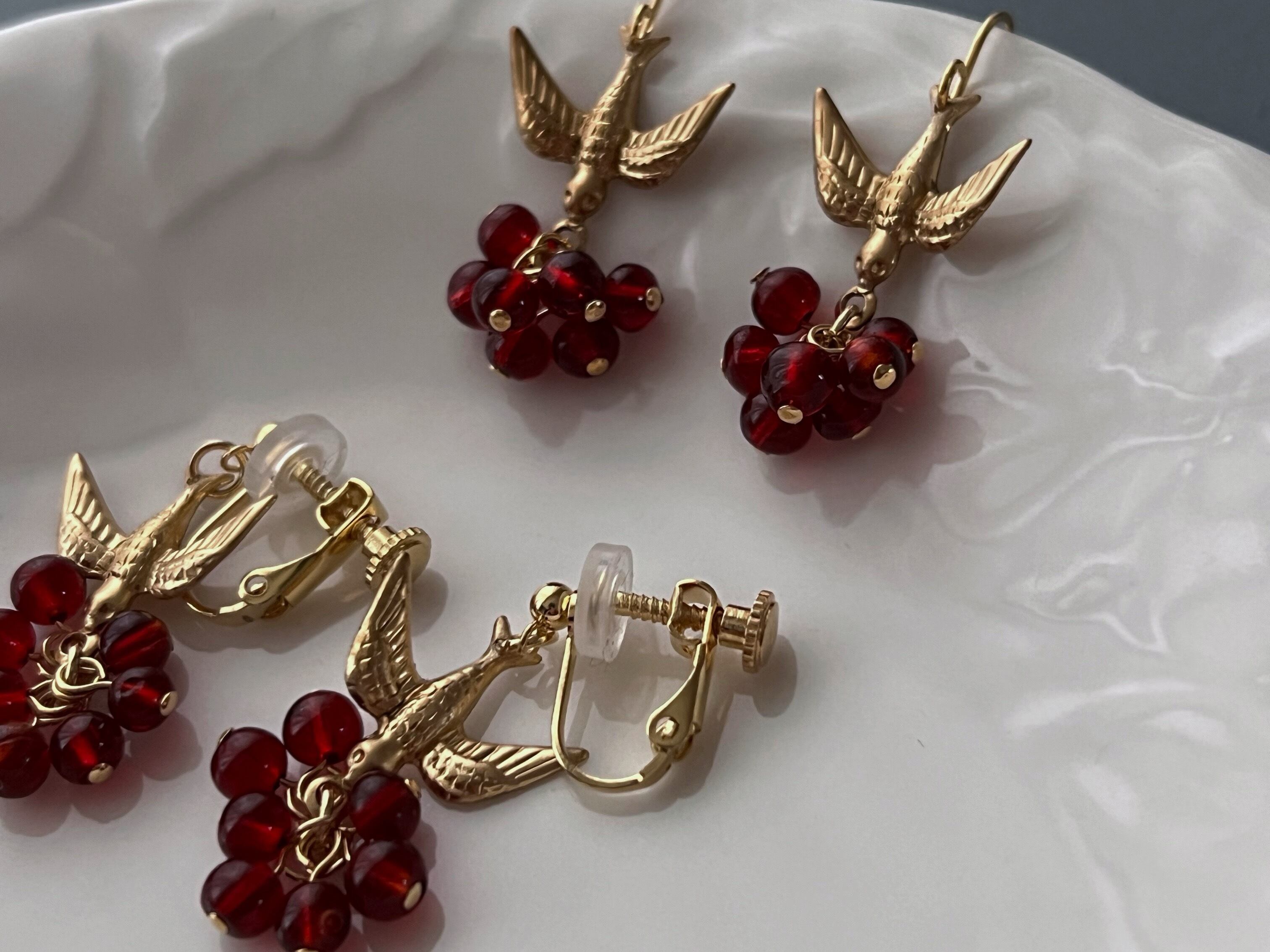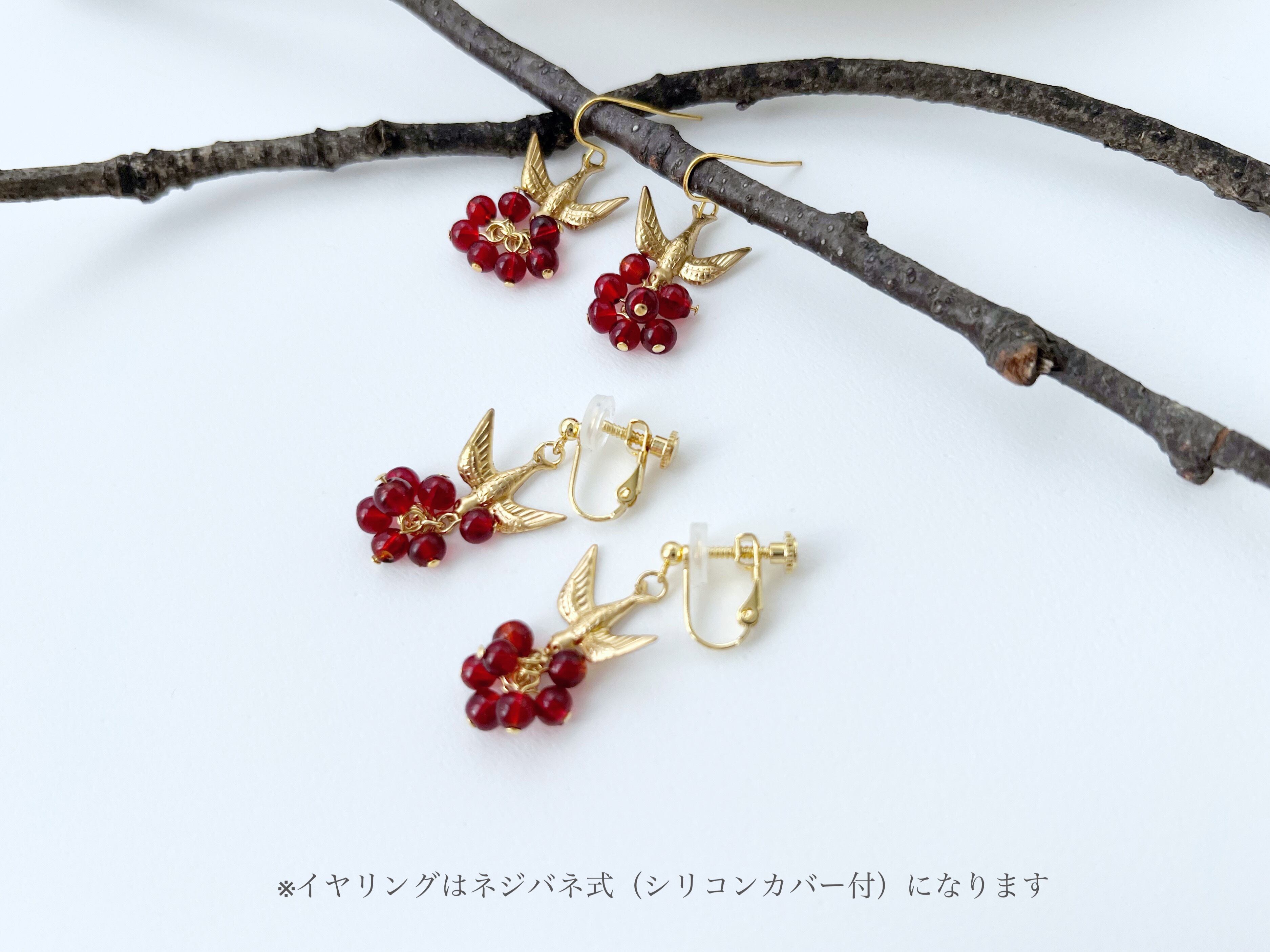 【 minori 】実りの耳飾り 赤い実/小鳥/ピアス/イヤリング/真鍮/ヴィンテージビーズ/ボタニカル